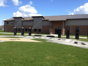 A granite obelisk bearing the names of those killed in action and training is found at the tip of the dagger. Six granite pillars each etched with a stanza of the Ranger Creed serves as vertical backdrop to the memorial. Stone walkways leading into each wing of the memorial are etched with the names of friends and supporters of the battalion. Two entry archways and three courtyard archways (representing Rangers of the WWII era and the contributions of Korea and Vietnam Rangers) serve as a continuous reminder of our Ranger heritage and provide a fitting remembrance of those that selflessly and valiantly sacrificed.